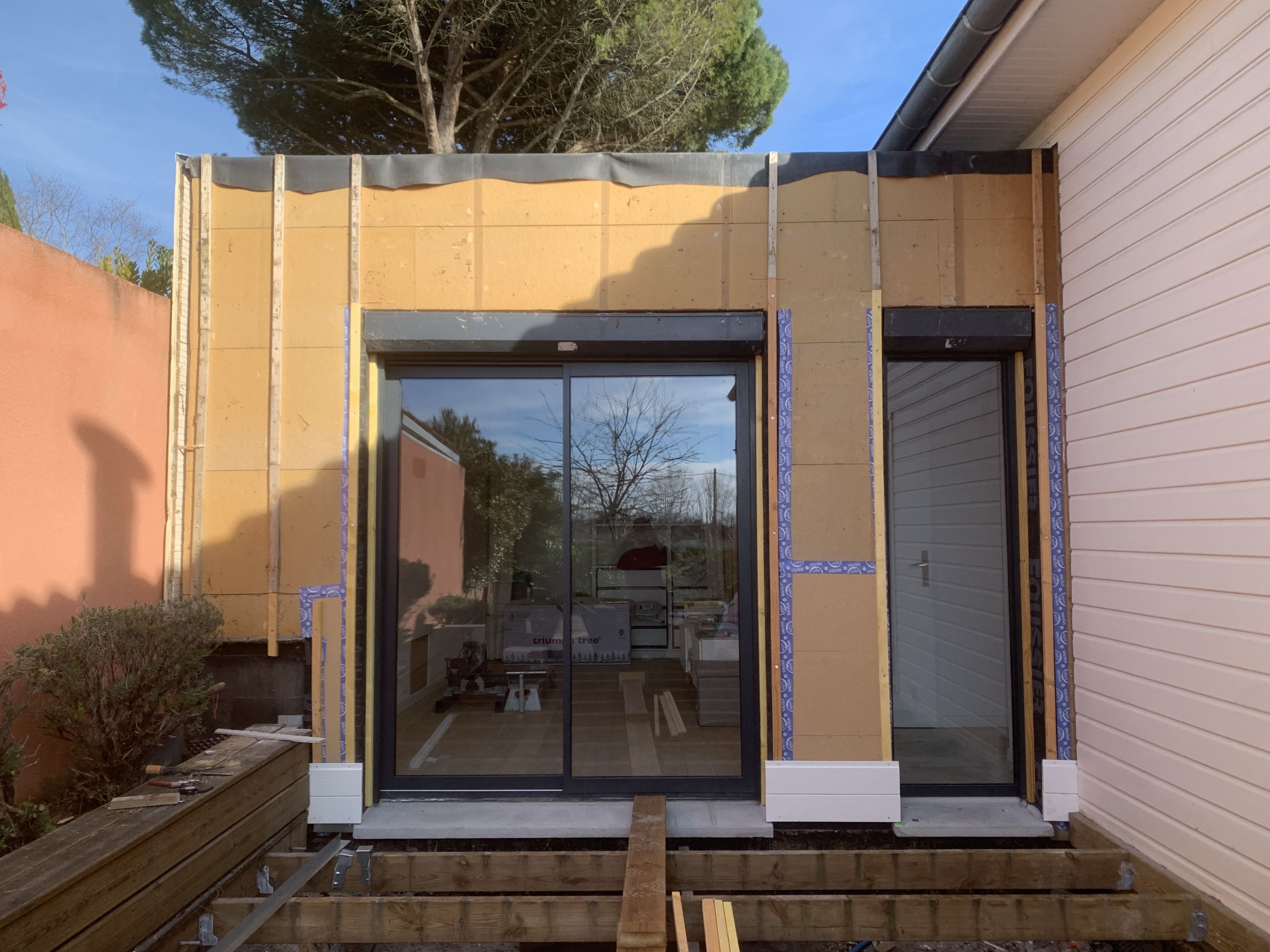 Suite à un défaut de mise en œuvre, le mur de cette maison en ossature bois présentait des dégâts liés à l'eau. Nous avons don été obligé d'assainir en déposant la partie endommagée et reconstruire à neuf. Pour cela nous avons du déposer les menuiseries, le bardage et la terrasse en bois. Nous avons en suie étayé, déposé et reconstruit le mur selon les normes en vigueur.