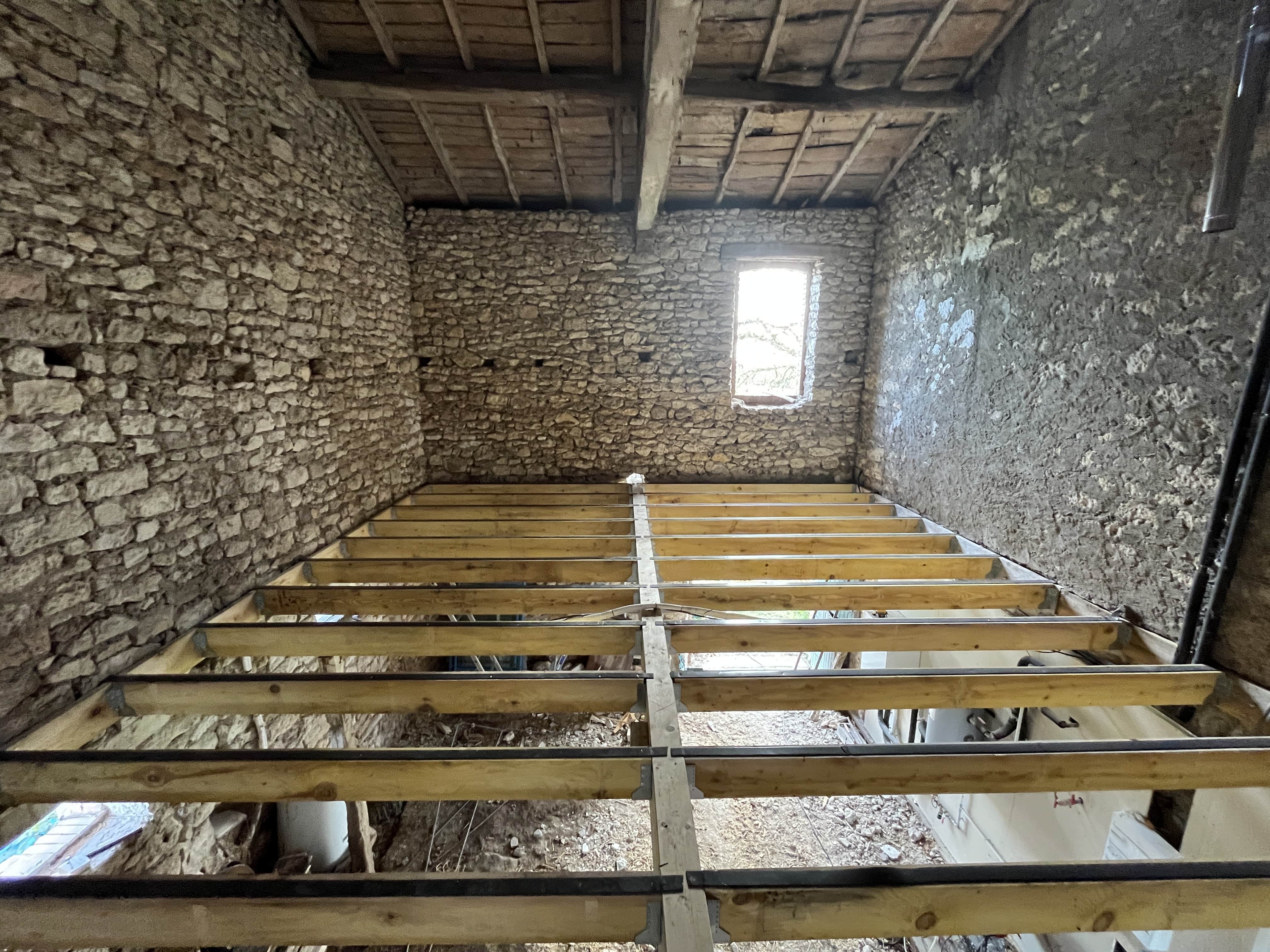 Rénovation d'un vieux plancher de grange. Après démolition de l'ancien plancher, nous avons créé des ouvertures dans les murs porteurs afin de sceller une grande poutre en lamellé-collé. Nous avons également ancré des murallières afin de fixer les solives sur des connecteurs métalliques. L'ensemble réglé grâce à un niveau laser afin d'obtenir une précision au millimètre.